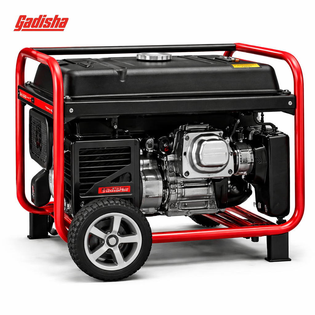 This heavy-duty portable generator features a durable, powder-coated steel frame (often red) enclosing a powerful 4-stroke, air-cooled OHV engine (typically black/grey). The control panel is strategically placed to offer easy access to multiple US-standard outlets, including essential 120V household receptacles and a high-amperage 120/240V twist-lock outlet for connecting to a home’s transfer switch or heavy-duty machinery. Designed for portability, the unit is typically sold with large, never-flat wheels and a folding handle, allowing one person to move the unit across various terrains, from a garage floor to a construction site.