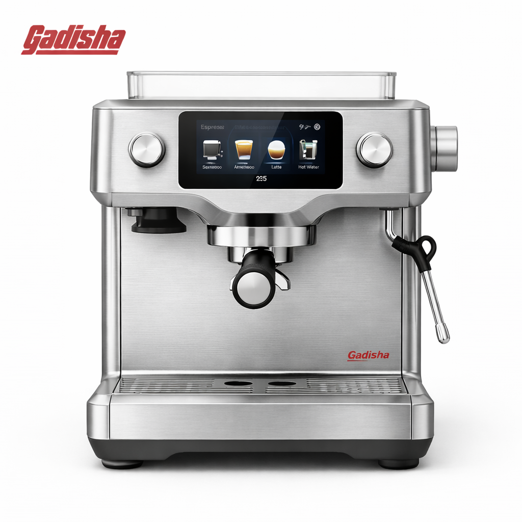 The Gadisha Automatic Espresso Machine combines professional-style brewing with an intuitive digital interface. A high-pressure pump system ensures consistent espresso extraction, while the integrated display allows users to select common drinks such as espresso, americano, latte, and hot water with ease.