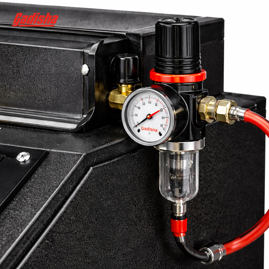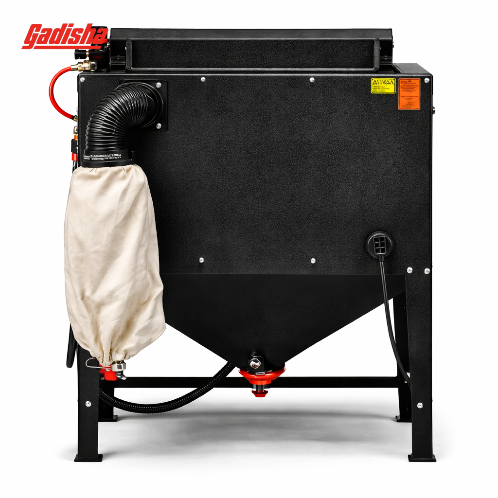 The Gadisha Benchtop Abrasive Blast Cabinet is constructed from durable steel with a powder-coated finish for longevity. It utilizes a siphon-feed system where a compressed air-powered blast gun pulls abrasive media from the bottom hopper. Operation is controlled via a foot-pedal switch, leaving both hands free to manipulate the workpiece inside the cabinet using the permanently attached rubber work gloves. The large, clear viewing window is protected by a replaceable film to prevent etching, and an internal light fixture provides excellent visibility. A key feature is the rear-mounted, motorized dust collector with a filter bag, which vacuums airborne dust and spent media to keep the workspace clean and visibility high during use. The cabinet also features a built-in air pressure regulator and gauge for precise control over the blasting process.