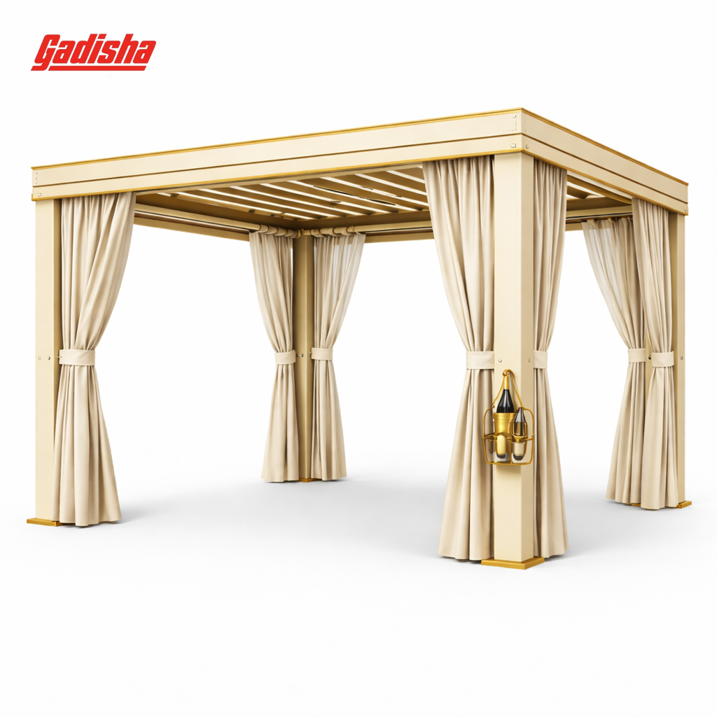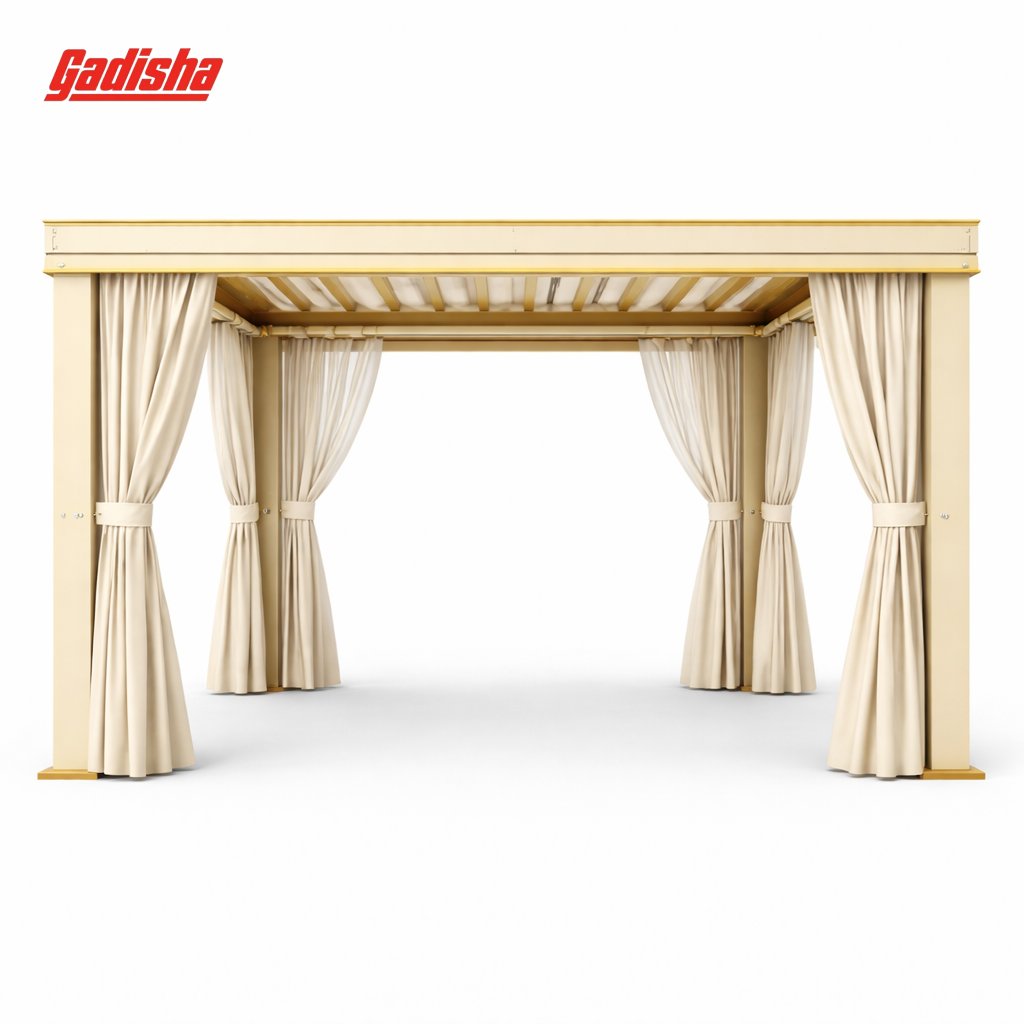 This model is a freestanding, fixed-roof luxury cabana characterized by a clean, modern architectural style. The structure features thick, durable vertical posts and horizontal beams constructed from high-grade aluminum. A key design element is the decorative metallic gold trim (or brushed bronze/brass) used for the post caps, base plates, and sometimes decorative lattice work, which provides a striking contrast against the dark or neutral-colored frame. The canopy is typically a fixed, durable fabric or composite material designed for long-term outdoor exposure. It is equipped with a complete set of four full-length, double-track outdoor curtains made from UV-resistant and water-repellent fabric, allowing for total privacy and adjustable shade.